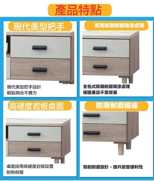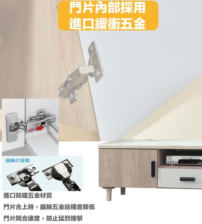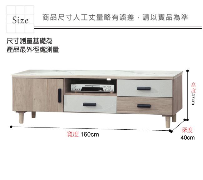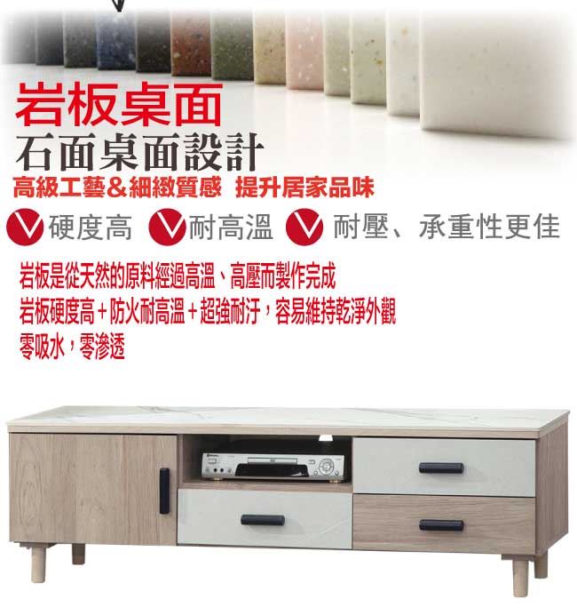 材質 | ◆產品名稱:【綠家居】卡爾夫岩板5.3尺單門三抽電視櫃/視聽櫃 尺寸:(寬)160x(深)40(高)47公分 ◆材質: 材質:防蛀木心板+防潮耐磨腳座+12mm高硬度岩板桌面板+五金滑軌結構+防夾手緩衝門片五金 噴漆:防潮耐磨噴漆處理