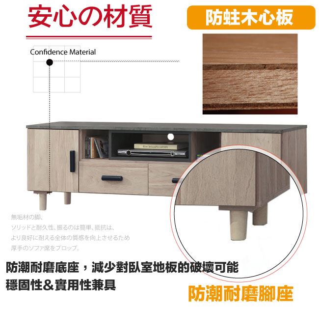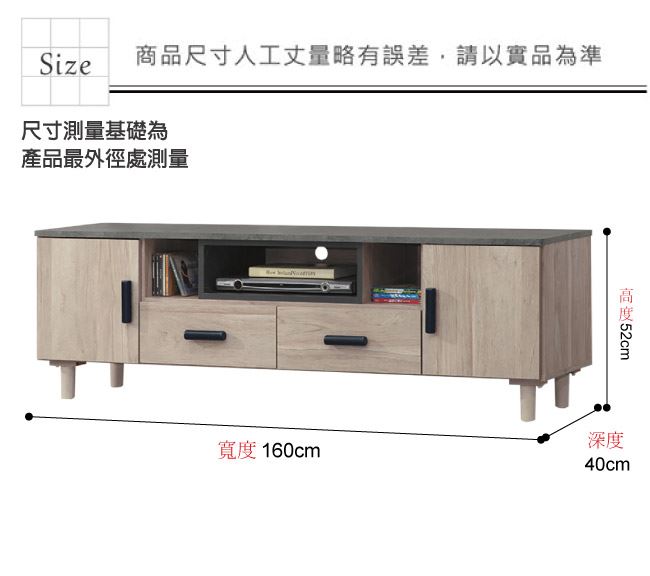 材質 | ◆產品名稱:【綠家居】路卡夫5.3尺二門二抽電視櫃/視聽櫃 尺寸:(寬)160x(深)40(高)52/公分 ◆材質: 材質:防蛀木心板+防潮耐磨腳座+五金滑軌結構+防夾手緩衝門片五金 噴漆:防潮耐磨噴漆處理