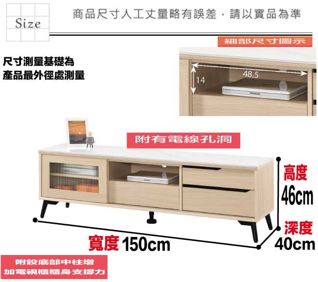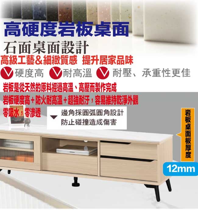 材質 | ◆產品名稱:【綠家居】蘭達5尺推門岩板三抽電視櫃 尺寸:(寬)150x(深)40(高)46/公分 ◆材質: 材質:防蛀木心板+烤漆金屬腳座+五金滑軌結構+5mm直紋強化玻璃+12mm高硬度岩板 表面防潮耐磨噴漆處理 |