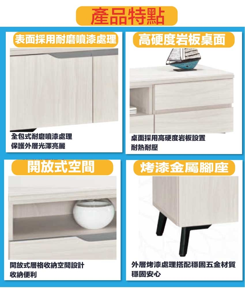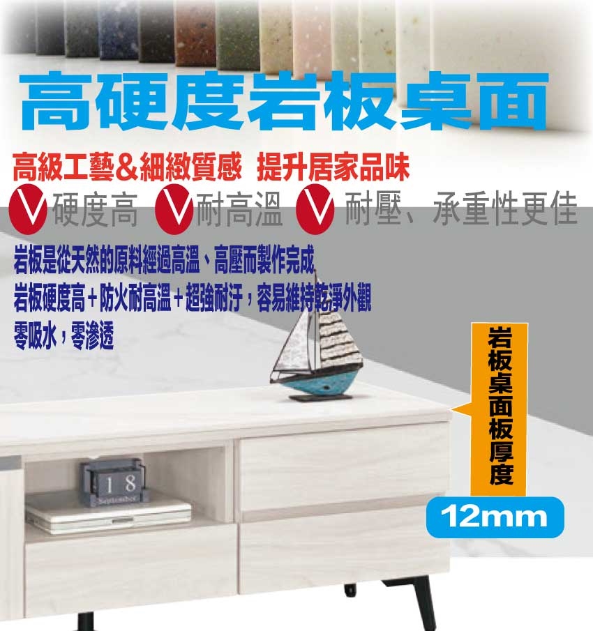 採用防蛀木心板+烤漆五金腳座+防夾手緩衝五金+12mm高硬度岩板桌面板+五金滑軌結構等安心材質製造