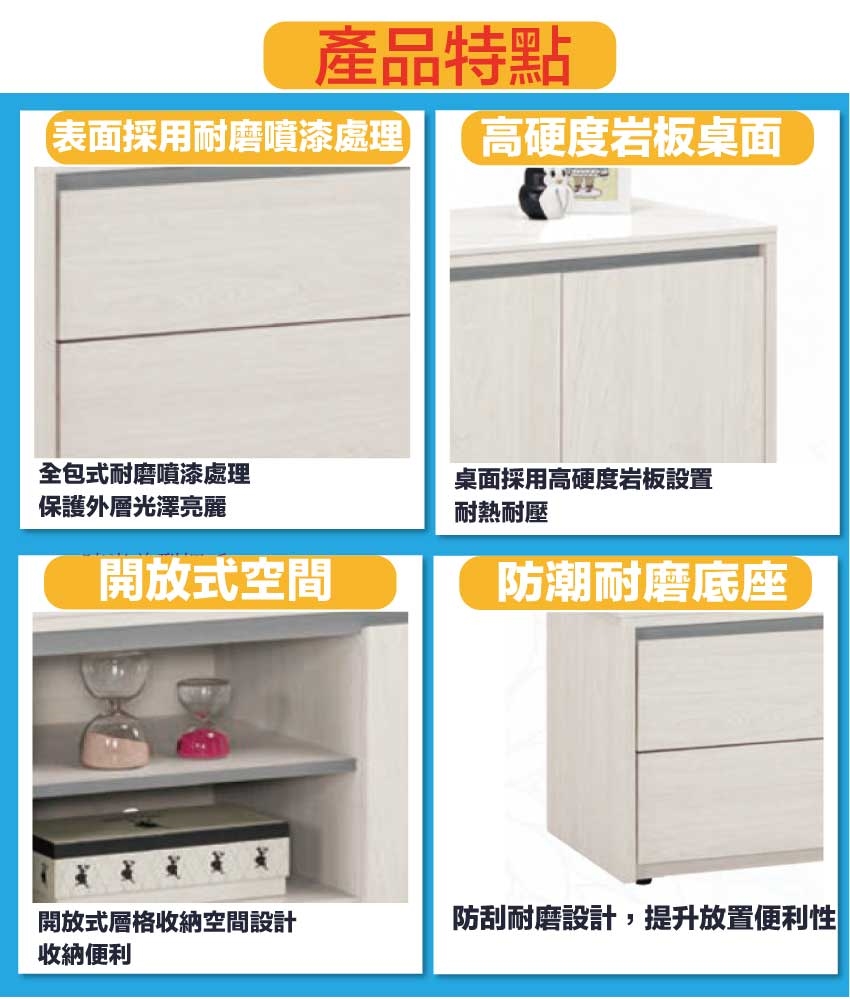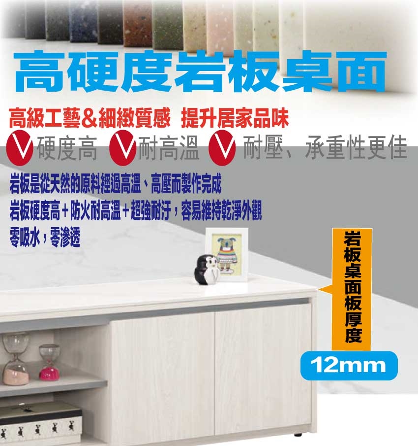 材質:防蛀木心板+防潮耐磨底座+防夾手緩衝門片五金+五金滑軌結構+12mm高硬度岩板桌面板