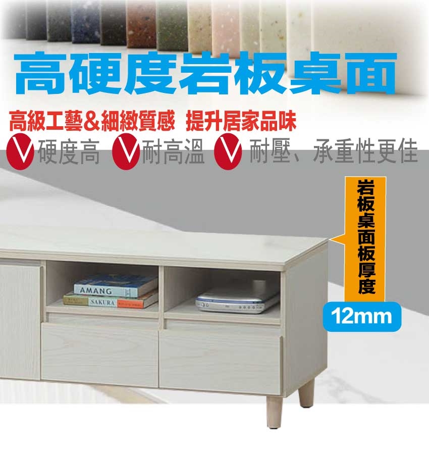 材質:防蛀木心板+防刮實木腳座+五金滑軌結構+防夾手環衝門片五金+12mm高硬度岩板桌面板