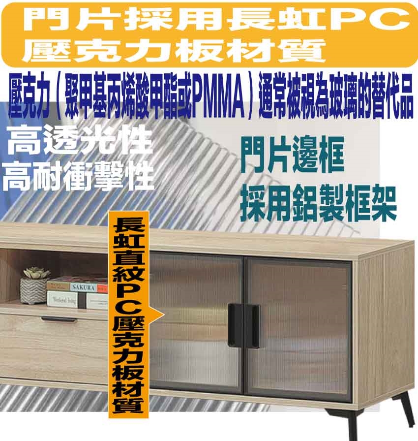 材質:防蛀木心板+烤漆五金腳座+黑漆鋁製門框+長虹PC材質門片+防夾手緩衝門片五金+五金滑軌結構