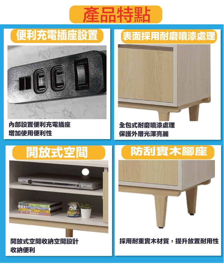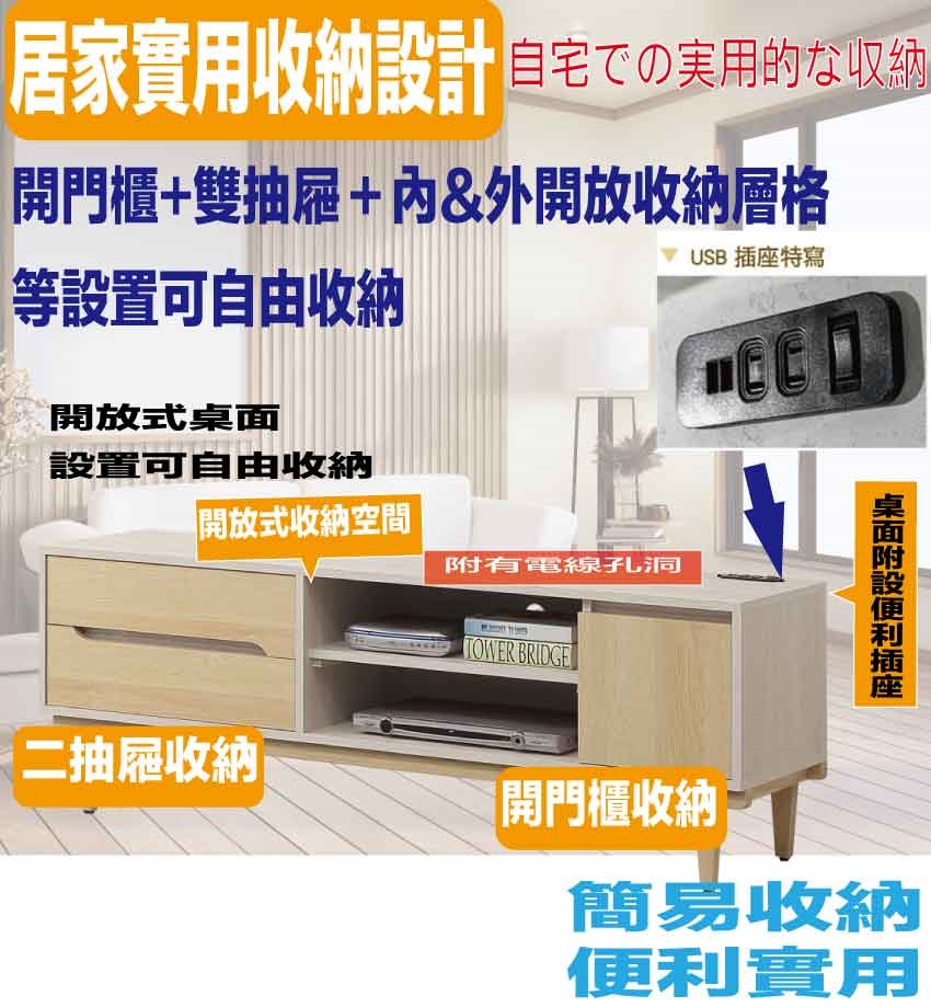 搭配採用開門櫃+二抽屜+開放層格+附插座單個等收納空間設計