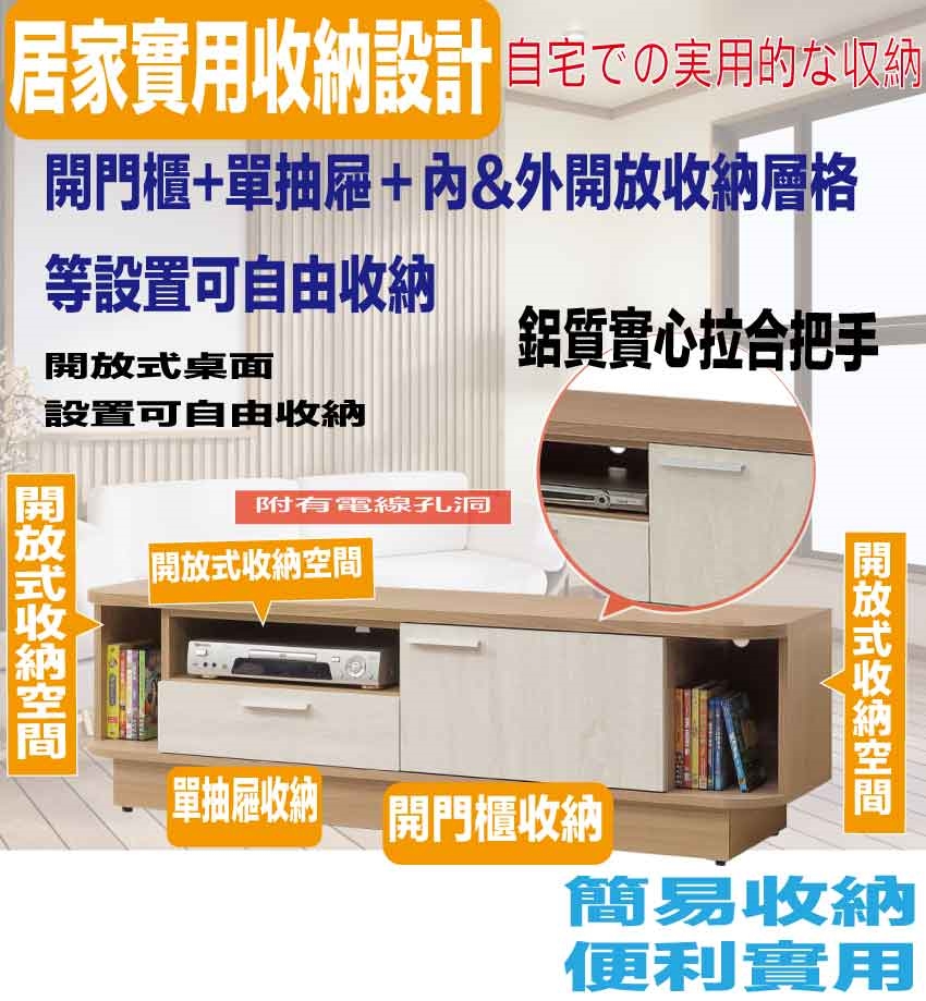 搭配採用開門櫃+單抽屜+開放層格等收納空間設計