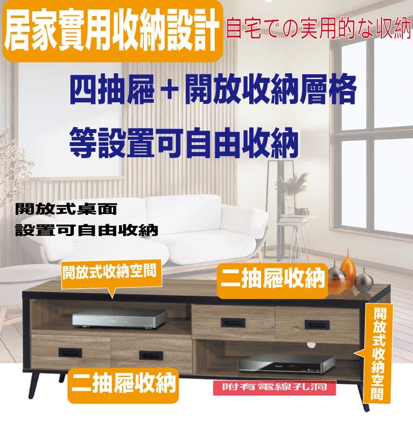 搭配採用四抽屜+開放式層格等收納空間設計