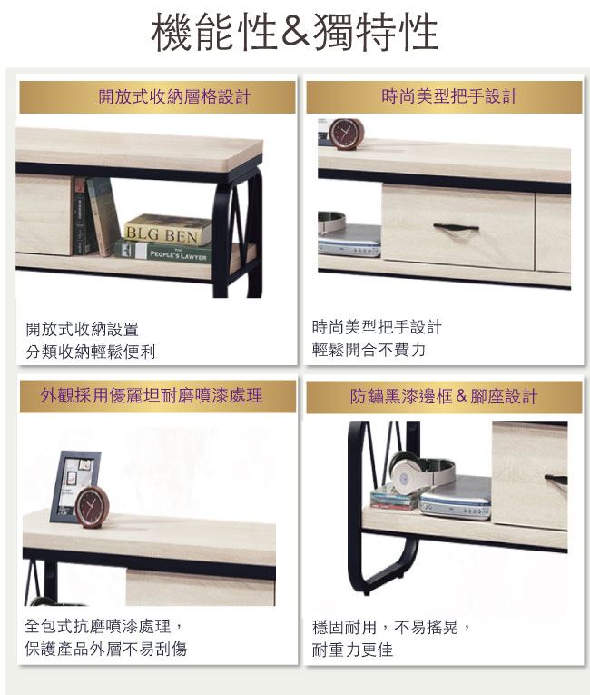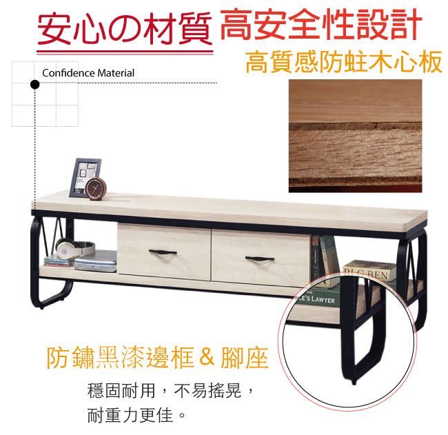 材質 | ◆產品名稱:【綠家居】 韋尼德 時尚6尺二抽電視櫃/視聽櫃 尺寸:(寬)179x(深)39.2x(高)48/公分 ◆材質: 材質:防蛀木心板+五金滑軌結構+黑鐵砂框架&腳座 |