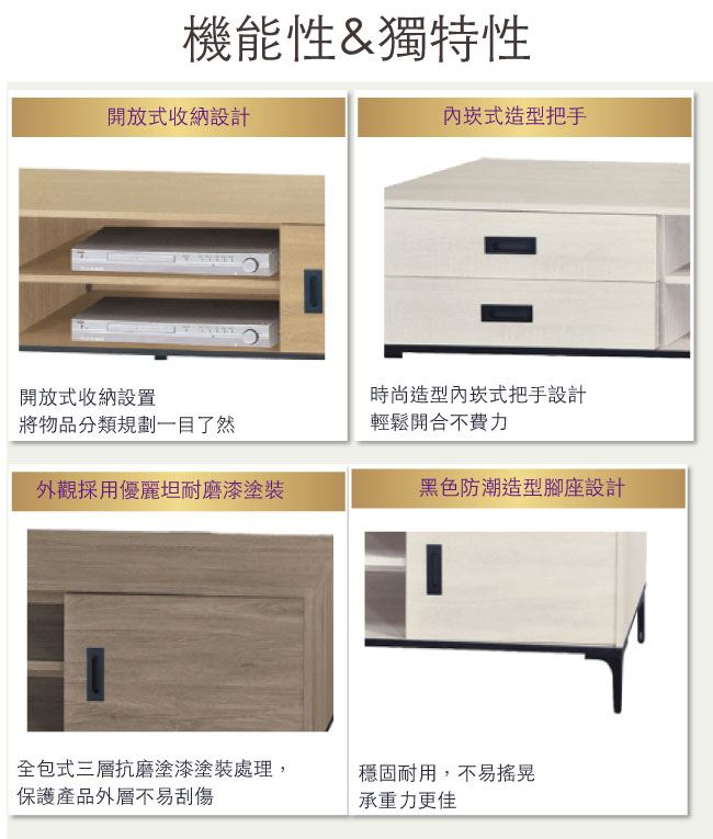 材質 | ◆產品名稱:【綠家居】亞塞 現代6尺單門二抽電視櫃/視聽櫃(三色可選) 電視櫃尺寸:(寬)181x(深)41x(高)47/公分 ◆材質: 材質:防夾手緩衝門片五金+黑鐵砂腳座+防蛀木心板+五金滑軌結構 塗漆:優利坦三層全包式耐磨塗漆塗裝處理 |