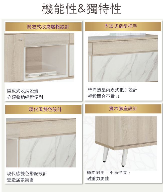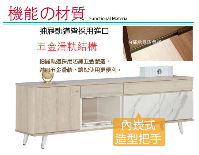 材質 | ◆產品名稱:【綠家居】扎爾 雙色6尺三門二抽電視櫃/視聽櫃 尺寸:(寬)181x(深)40x(高)56/公分 ◆材質: 材質:防蛀木心板+五金滑軌結構+防潮實木腳座+防夾手緩衝門片五金 |