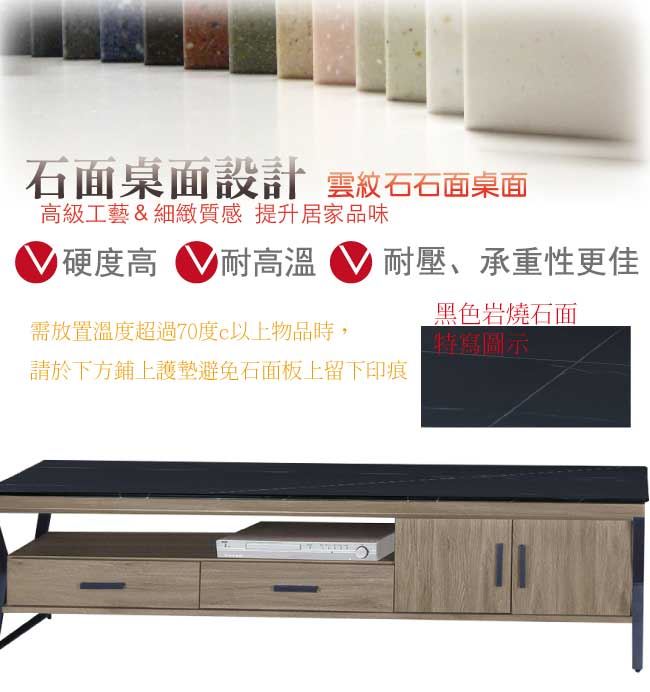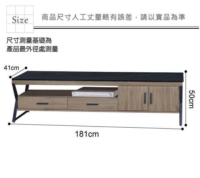 材質 | ◆產品名稱: 【綠家居】梅尼 二門6尺石面&岩板二抽電視櫃(三色石面可選) 尺寸:(寬)181x(深)41x(高)50/公分 ◆材質: 材質:防蛀木心板+黑鐵砂框架&腳座+五金滑軌結構+12mm雲紋石&岩板面板 噴漆:防潮耐磨噴漆處理