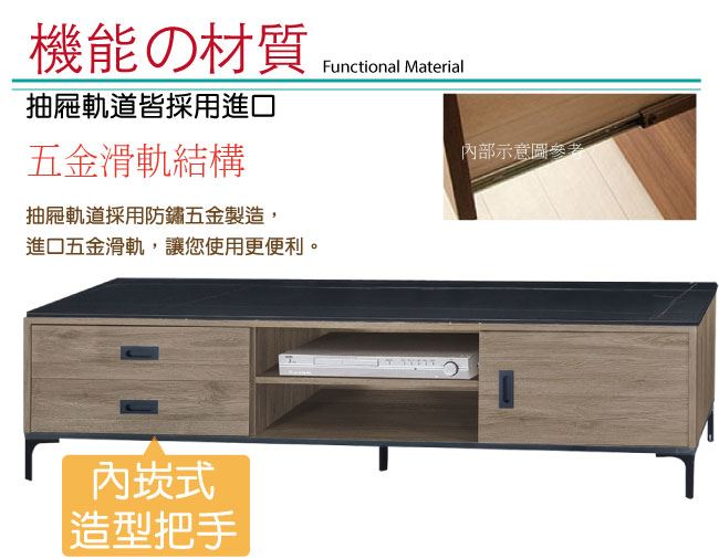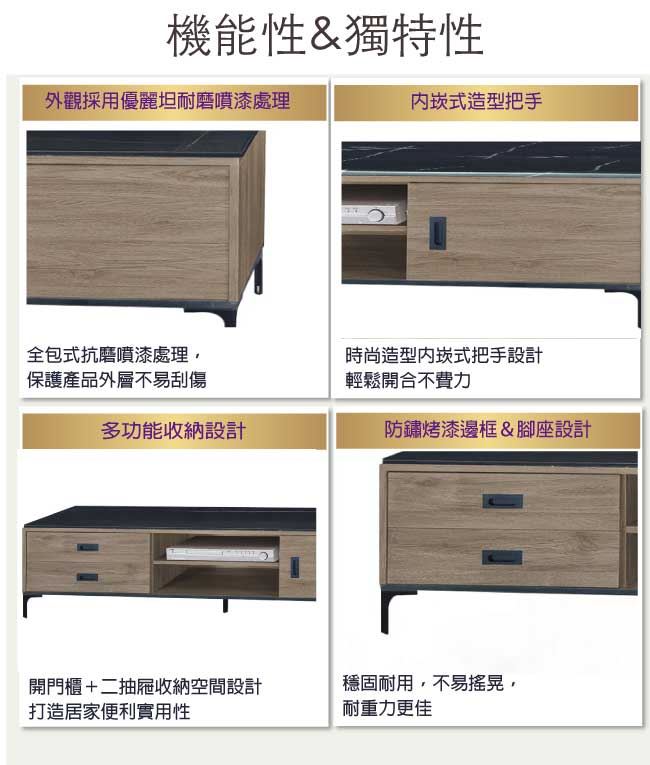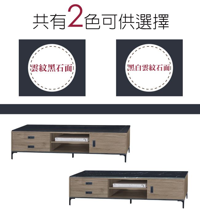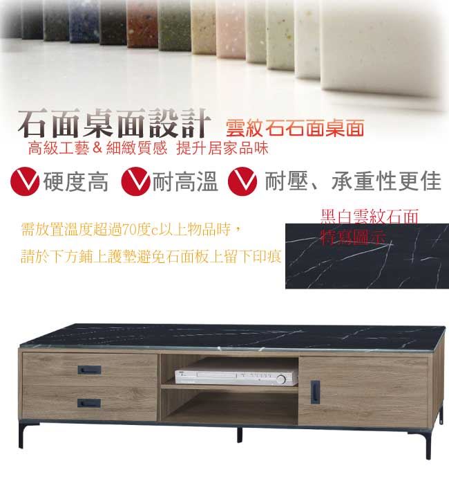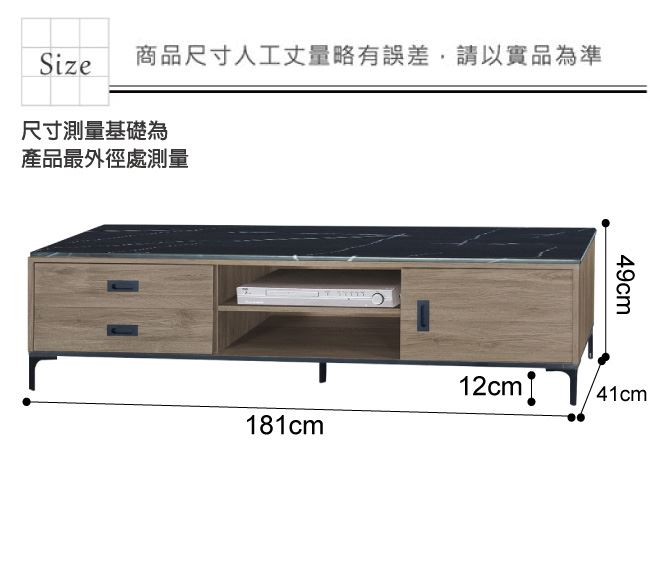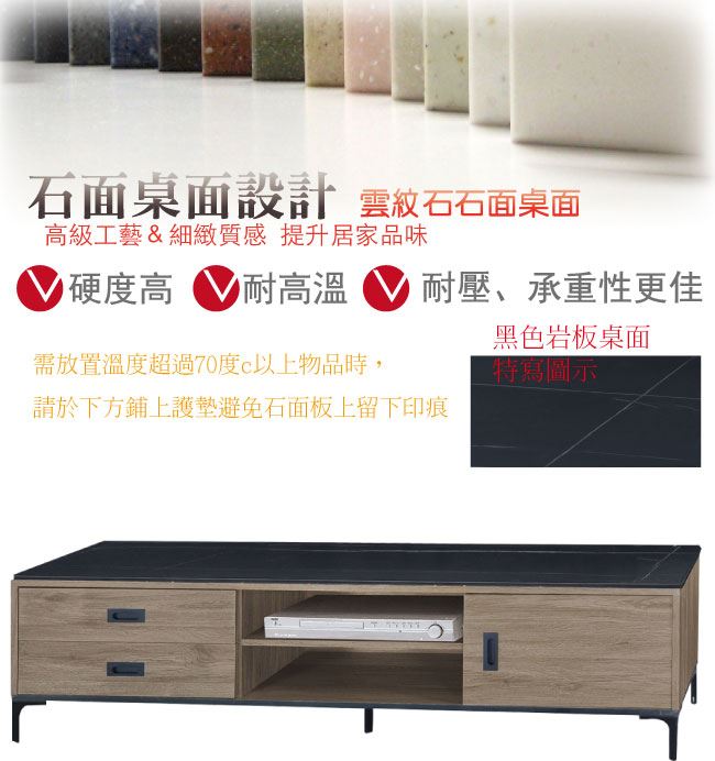 材質 | ◆產品名稱: 【綠家居】羅威凱 單門6尺石面&岩板二抽電視櫃(二色石面可選) 尺寸:(寬)181x(深)41x(高)49/公分 ◆材質: 材質:防蛀木心板+黑鐵砂框架&腳座+五金滑軌結構+12mm雲紋石&岩板面板 噴漆:防潮耐磨噴漆處理