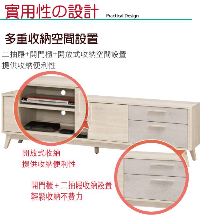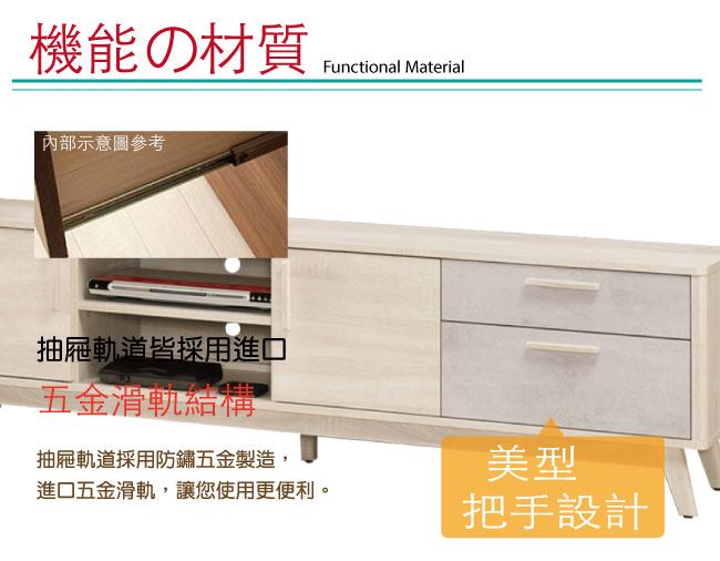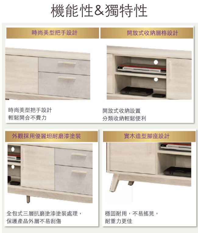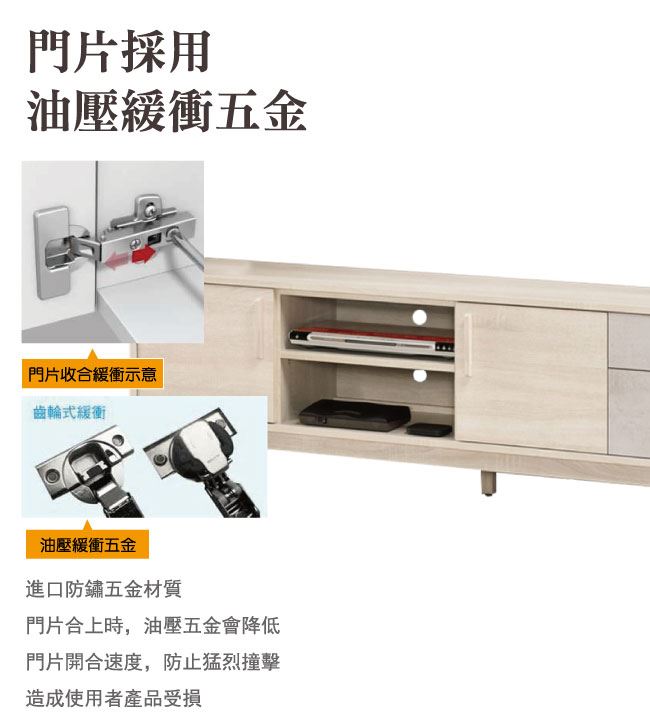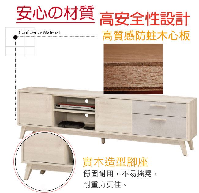 商品介紹 | 【綠家居】諾比曼 時尚6尺二門二抽電視櫃 淺橡木紋雙色系+現代簡約風格+安心材質製造,整體採用防蛀木心板+防潮實木腳座+五金滑軌結構+防夾手緩衝門片五金等安心材質製造,產品外層採用防潮耐磨噴漆處理搭配二抽屜+開門櫃+開放式收納層格等收納空間設計,全由專人配送到家,專業安心服務,替你省下更多時間! 【商品特色】 淺橡木紋雙色系+現代簡約風格+安心材質製造,使用放心+搭配居家更便利 採用防蛀木心板+防潮實木腳座+五金滑軌結構+防夾手緩衝門片五金等安心材質製造 產品外層採用防潮耐磨噴漆處理 搭配採用二抽屜+開門櫃+開放式收納層格等收納空間設計 此商品不需要DIY組立,此商品為組立後之成品 品質保證、專業設計、貼心服務 全由專人配送到家,專業安心服務,替您省下更多時間 |