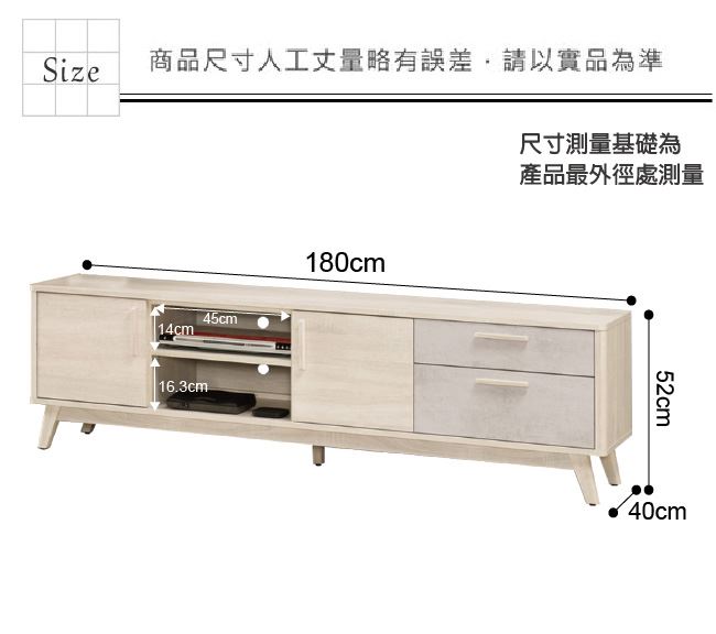材質 | ◆產品名稱: 【綠家居】諾比曼 時尚6尺二門二抽電視櫃 電視櫃尺寸:(寬)180x(深)40x(高)52/公分 ◆材質: 材質:防蛀木心板+防潮實木腳座+五金滑軌結構+防夾手緩衝門片五金 噴漆:防潮耐磨噴漆處理