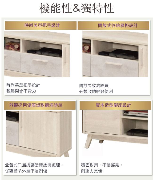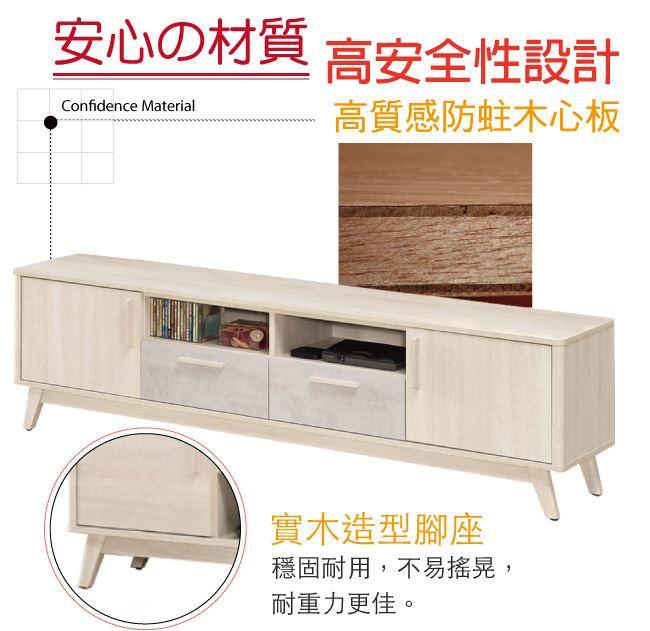 商品介紹 | 【綠家居】諾比曼 雙色二抽6尺二門電視櫃 淺橡木紋雙色系+現代簡約風格+安心材質製造,整體採用防蛀木心板+防潮實木腳座+五金滑軌結構+防夾手緩衝門片五金等安心材質製造,產品外層採用防潮耐磨噴漆處理搭配二抽屜+開門櫃+開放式收納層格等收納空間設計,全由專人配送到家,專業安心服務,替你省下更多時間! 【商品特色】 淺橡木紋雙色系+現代簡約風格+安心材質製造,使用放心+搭配居家更便利 採用防蛀木心板+防潮實木腳座+五金滑軌結構+防夾手緩衝門片五金等安心材質製造 產品外層採用防潮耐磨噴漆處理 搭配採用二抽屜+開門櫃+開放式收納層格等收納空間設計 此商品不需要DIY組立,此商品為組立後之成品 品質保證、專業設計、貼心服務 全由專人配送到家,專業安心服務,替您省下更多時間 |