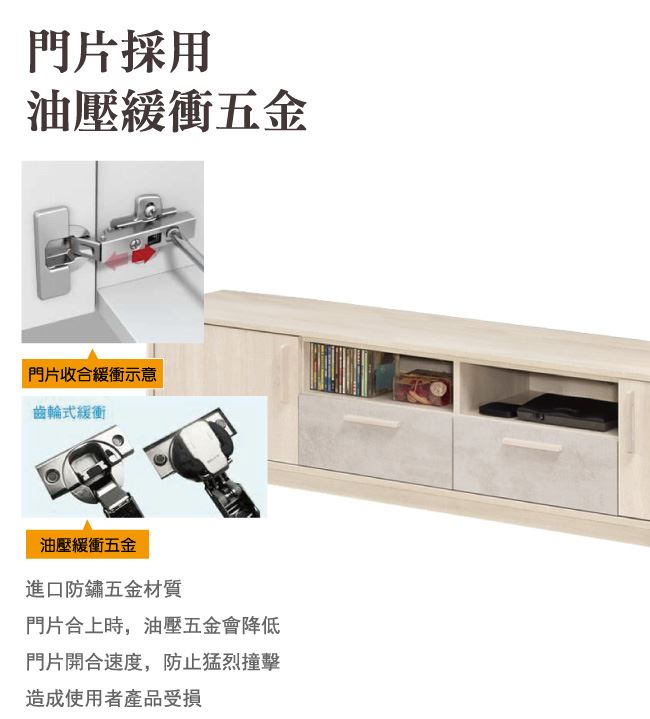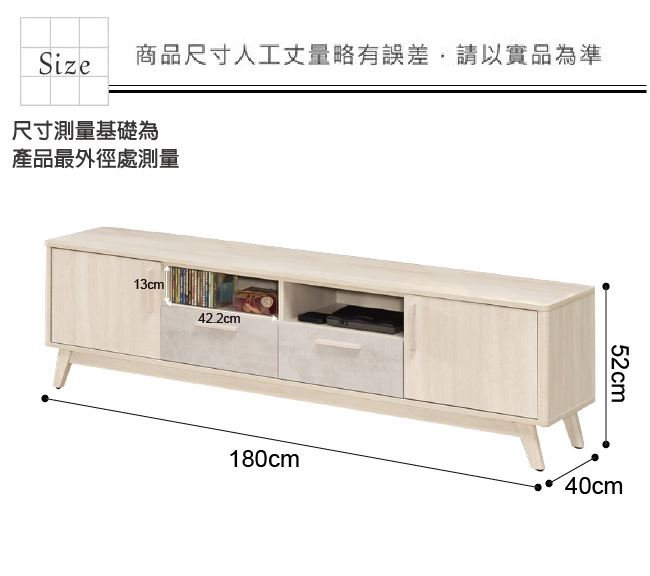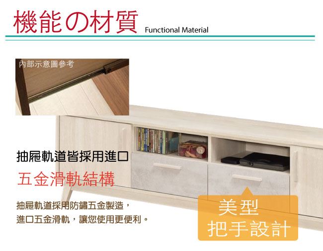 材質 | ◆產品名稱: 【綠家居】諾比曼 雙色二抽6尺二門電視櫃 電視櫃尺寸:(寬)180x(深)40x(高)52/公分 ◆材質: 材質:防蛀木心板+防潮實木腳座+五金滑軌結構+防夾手緩衝門片五金 噴漆:防潮耐磨噴漆處理