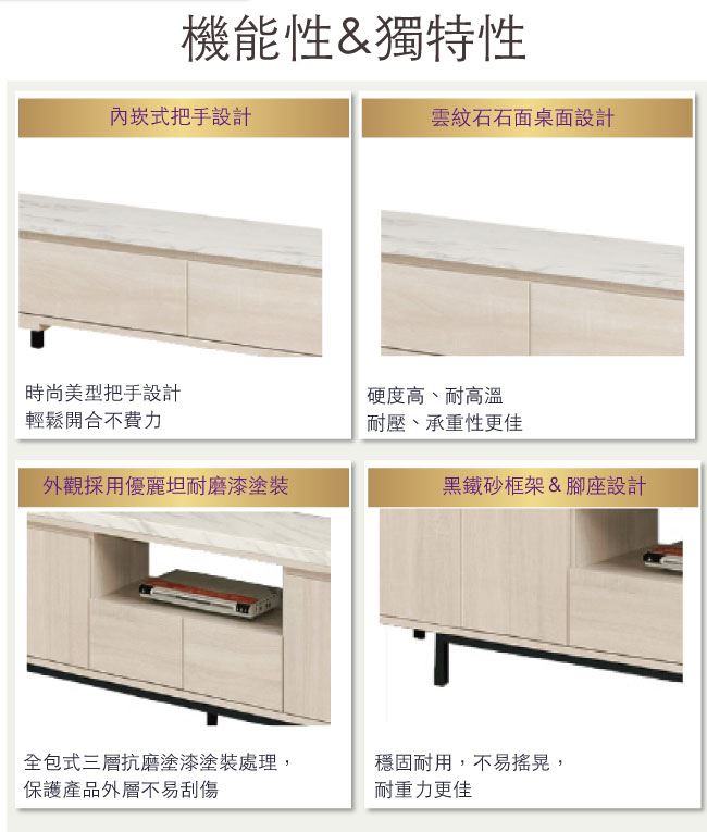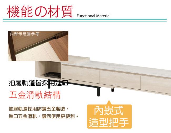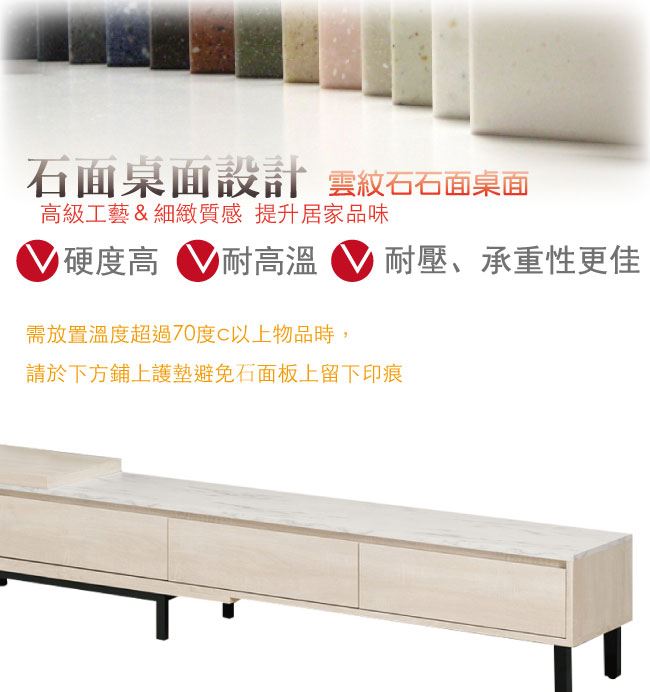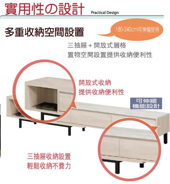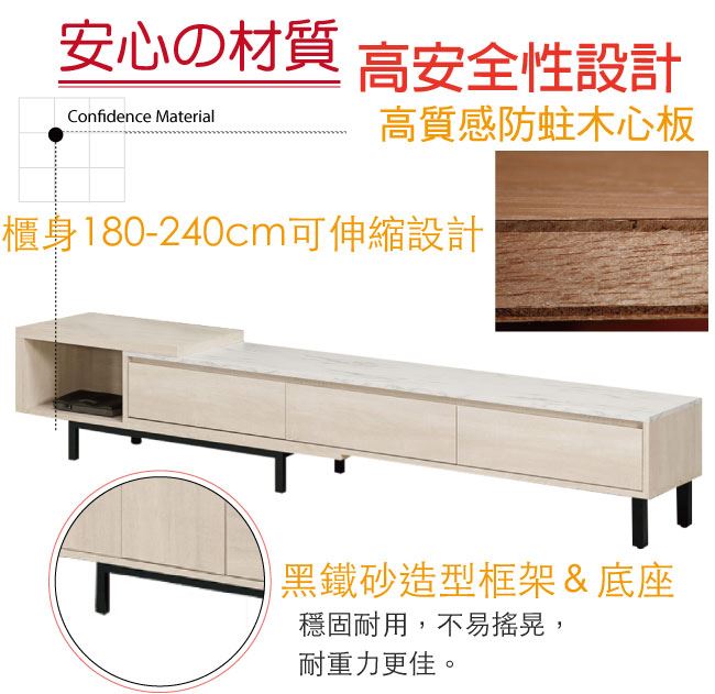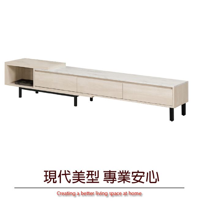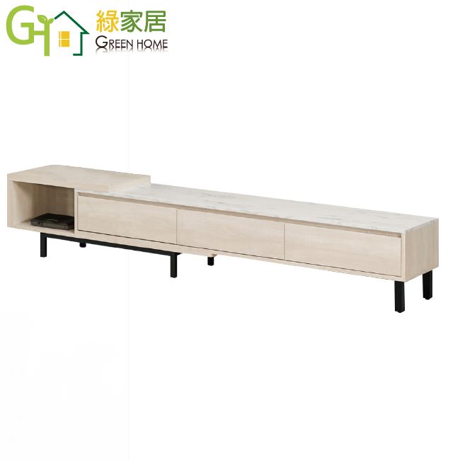 商品介紹 | 【綠家居】曼克特 可伸縮6尺雲紋石面電視櫃(可伸縮機能設計) 淺橡木紋色系+現代簡約風格+安心材質製造,整體採用防蛀木心板+黑鐵砂框架&腳座+五金滑軌結構+2cm雲紋石面板等安心材質製造,產品外層採用防潮耐磨噴漆處理搭配三抽屜+開放式收納層格等收納空間設計,全由專人配送到家,專業安心服務,替你省下更多時間! 【商品特色】 淺橡木紋色系+現代簡約風格+安心材質製造,使用放心+搭配居家更便利 電視櫃櫃體寬度可做180-240cm伸縮使用,可視居家需求變化使用 採用防蛀木心板+黑鐵砂框架&腳座+五金滑軌結構+2cm雲紋石面板等安心材質製造 產品外層採用防潮耐磨噴漆處理 搭配採用三抽屜+開放式收納層格等收納空間設計 此商品不需要DIY組立,此商品為組立後之成品 品質保證、專業設計、貼心服務 全由專人配送到家,專業安心服務,替您省下更多時間 |