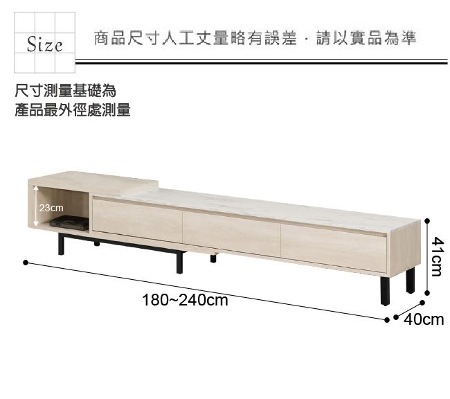 材質 | ◆產品名稱: 【綠家居】曼克特 可伸縮6尺雲紋石面電視櫃(可伸縮機能設計) 電視櫃尺寸:(寬)180-240x(深)40x(高)41/公分 ◆材質: 材質:防蛀木心板+黑鐵砂框架&腳座+五金滑軌結構+2cm雲紋石面板 噴漆:防潮耐磨噴漆處理