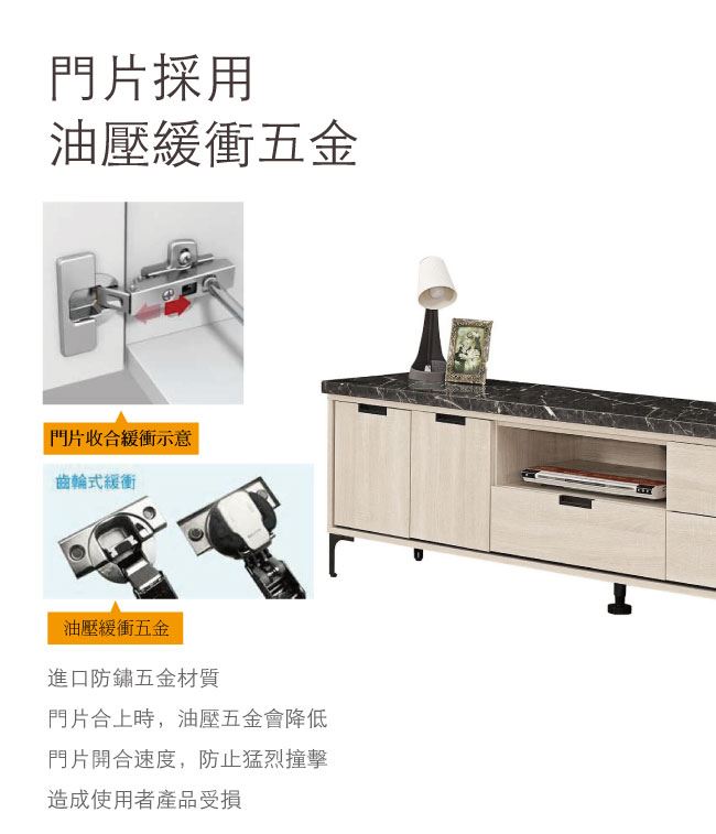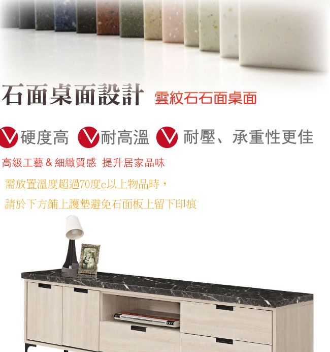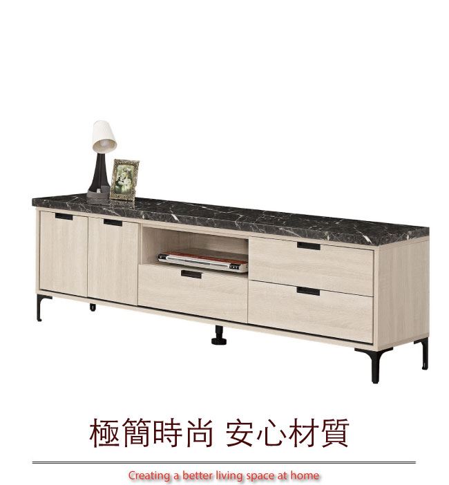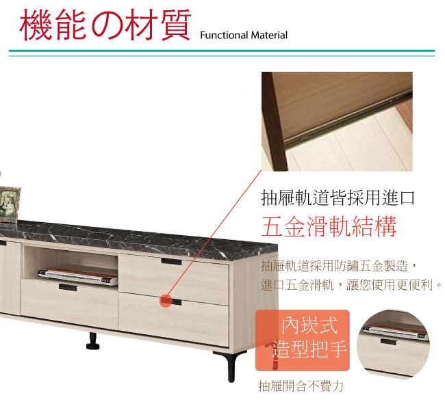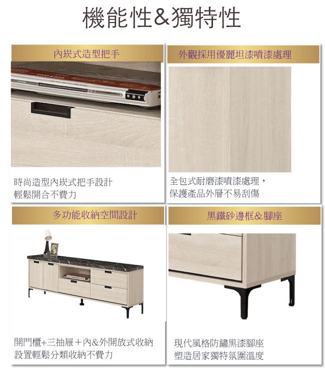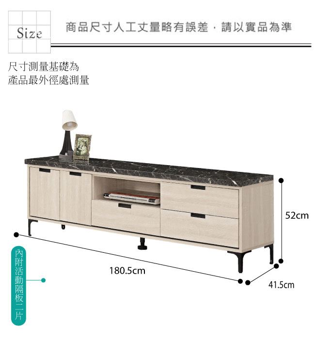 材質 | ◆產品名稱: 【綠家居】柏麗 淺橡6尺雲紋石面電視櫃/視聽櫃 產品尺寸: 尺寸:(寬)180.5x(深)41.5x(高)52公分 ◆材質: 材質:防蛀木心板+黑鐵砂腳座+2cm雲紋石面桌面板 材質:五金滑軌結構+防夾手緩衝門片五金 塗漆:優利坦全包式耐磨噴漆處理