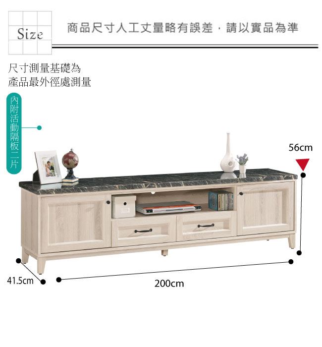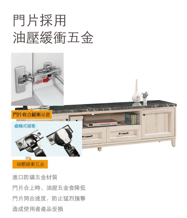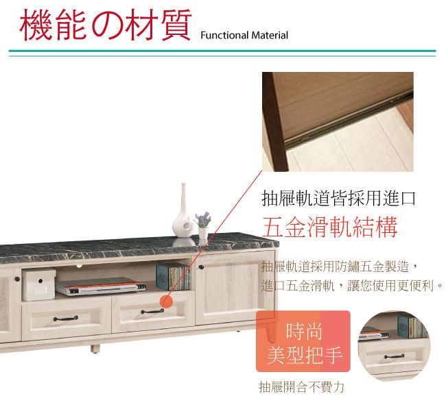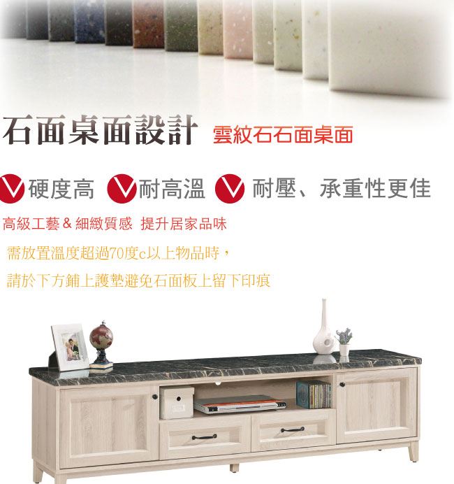 材質 | ◆產品名稱: 【綠家居】馬拉提 淺橡6.7尺雲紋石面電視櫃/視聽櫃 產品尺寸: 尺寸:(寬)200x(深)41.5x(高)56公分 ◆材質: 材質:防蛀木心板+耐磨防刮腳座+2cm雲紋石面桌面板 材質:五金滑軌結構+防夾手緩衝門片五金 塗漆:優利坦全包式耐磨噴漆處理