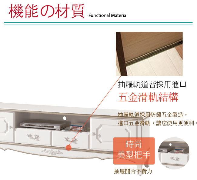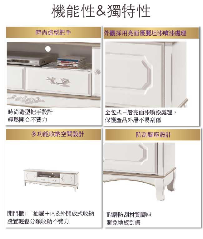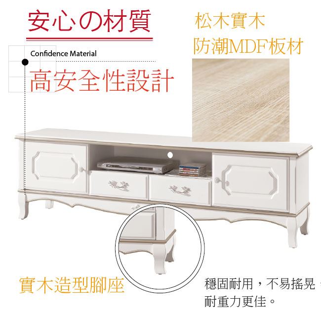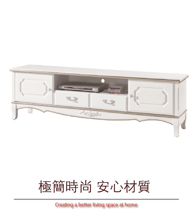 商品介紹 | 【綠家居】皮伊蒂 法式白6.1尺二門二抽實木電視櫃/視聽櫃 法式白色系+現代簡約風格+安心材質製造,整體採用松木實木+防潮MDF板材+防潮實木腳座+五金滑軌結構等安心材質製造,外層採用優利坦全包式亮面噴漆處理搭配開門櫃+二抽屜+開放式收納等收納設計,全由專人配送到家,專業安心服務,替你省下更多時間! 【商品特色】 法式白色系+現代簡約風格+安心材質製造,使用放心+搭配居家更便利 採用松木實木+防潮MDF板材+防潮實木腳座+五金滑軌結構等安心材質製造 開門櫃+二抽屜+開放式收納等收納設計 此商品不需要DIY組立,此商品為組立後之成品 品質保證、專業設計、貼心服務 全由專人配送到家,專業安心服務,替您省下更多時間 |