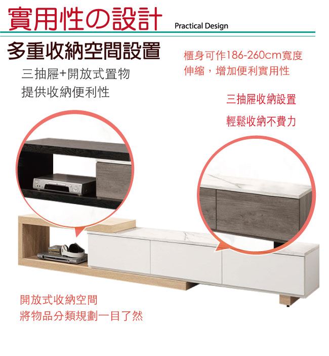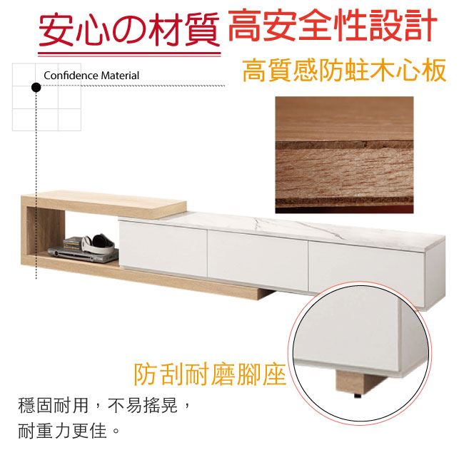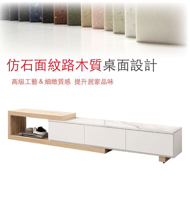 商品 介紹 | 【綠家居】拉多巴 雙色6.2尺仿雲紋伸縮機能電視櫃 淺木紋雙色系+現代簡約風格+安心材質製造,整體採用防蛀木心板+五金滑軌結構+防潮耐刮底座+仿石面雲紋木質面板等安心材質製造,搭配採用三抽屜+開放式收納等收納空間設計,全由專人配送到家,專業安心服務,替你省下更多時間! 【商品特色】 淺木紋雙色系+現代簡約風格+安心材質製造,使用放心+搭配居家更便利 電視櫃可做186-260cm伸縮寬度設計便利居家使用 採用防蛀木心板+五金滑軌結構+防潮耐刮底座+仿石面雲紋木質面板等安心材質製造 採用三抽屜+開放式收納等收納空間設計 此商品不需要DIY組立,此商品為組立後之成品 全由專人配送到家,專業安心服務,替您省下更多時間 |