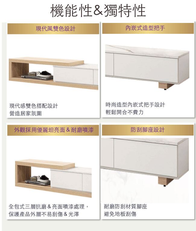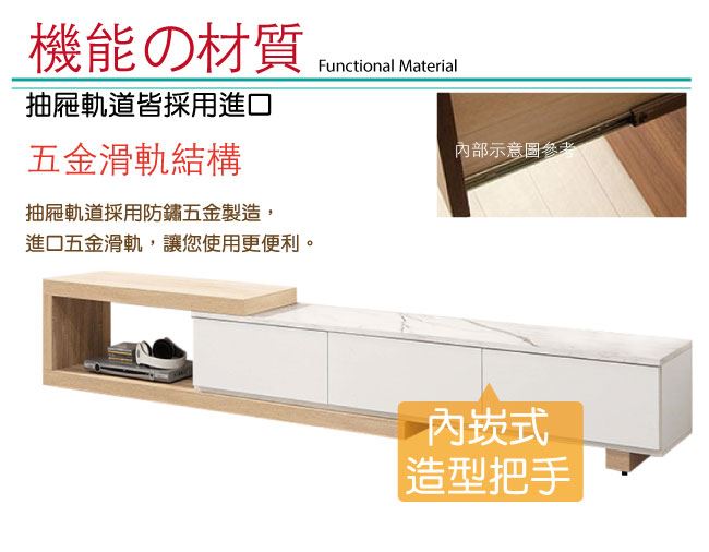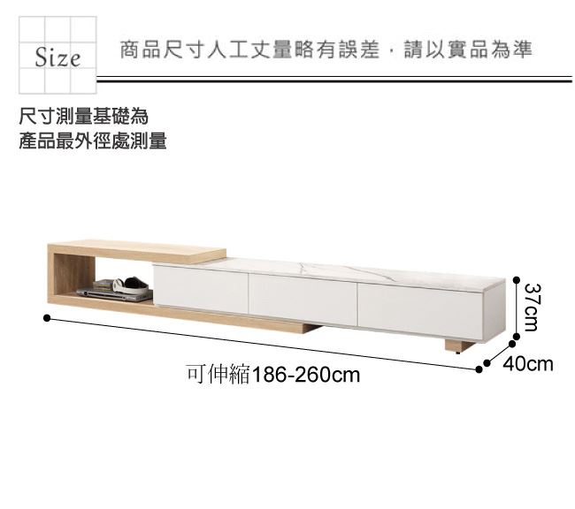 材質 | ◆產品名稱: 【綠家居】拉多巴 雙色6.2尺仿雲紋伸縮機能電視櫃 尺寸:(寬)186-260x(深)40x(高)37/公分 ◆材質: 材質:防潮MDF板材+五金滑軌結構+防潮耐刮底座+仿石面雲紋木質面板 外層採用耐磨&亮面噴漆處理
