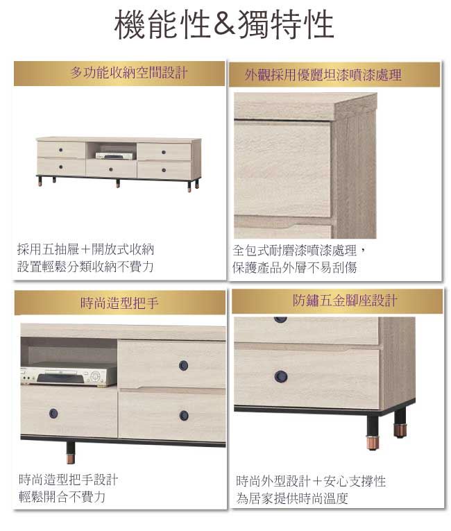 材質 | ◆產品名稱: 【綠家居】納卡西 淺橡6尺五抽電視櫃 產品尺寸: 尺寸:(寬)181x(深)41x(高)58/公分 ◆材質: 材質:防蛀木心板+防鏽五金腳座 材質:五金滑軌結構 塗漆:優利坦全包式耐磨噴漆處理