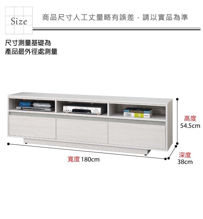 材質 | ◆產品名稱:【綠家居】斯塔林6尺三抽電視櫃/視聽櫃 尺寸:(寬)180x(深)38(高)54.5公分 ◆材質: 材質:防蛀木心板+防潮耐磨腳座+五金滑軌結構 噴漆:防潮耐磨噴漆處理