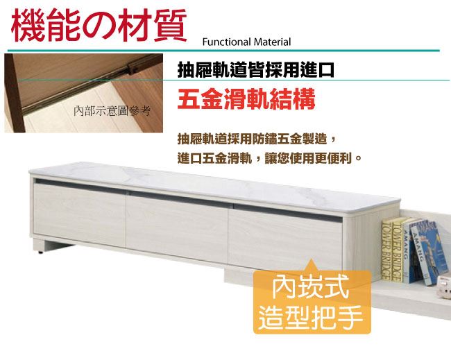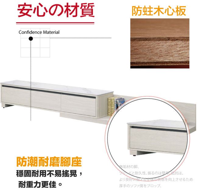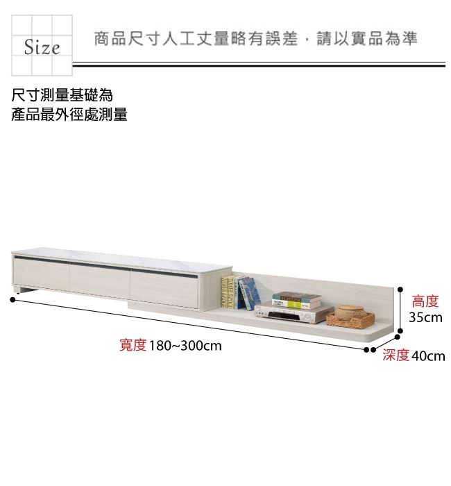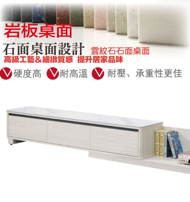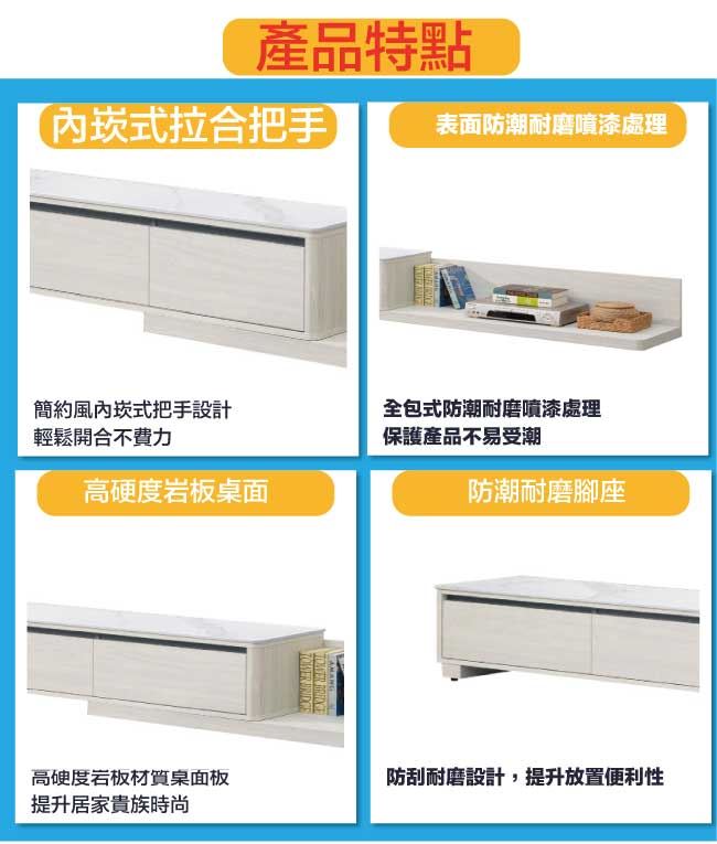 材質 | ◆產品名稱:【綠家居】魁北克6尺岩板伸縮電視櫃/視聽櫃 尺寸:(寬)180x(深)40(高)35公分 ◆材質: 材質:防蛀木心板+防潮耐磨腳座+五金滑軌結構+12mm高硬度岩板 噴漆:防潮耐磨噴漆處理
