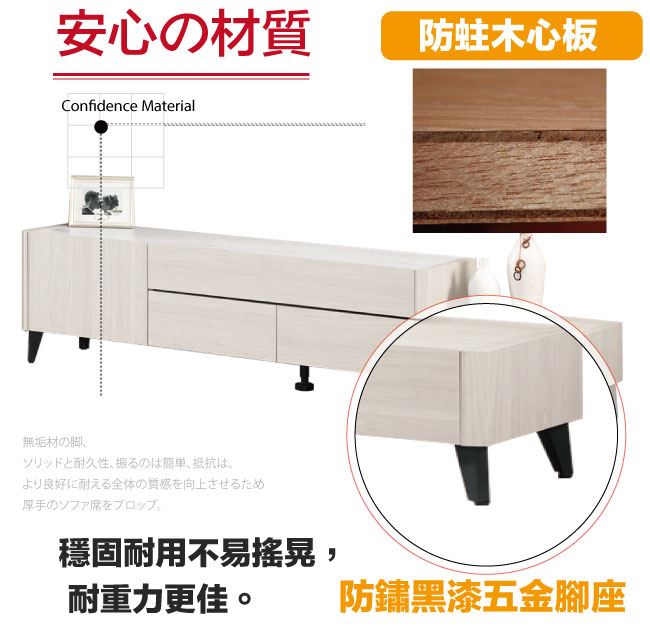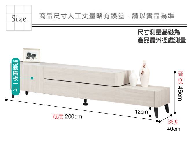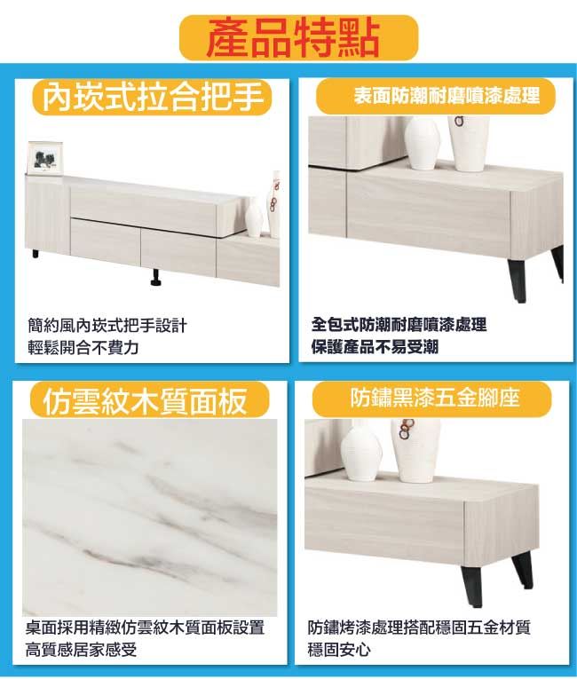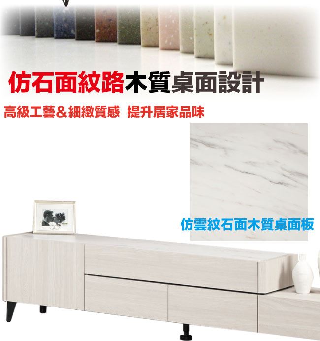 材質 | ◆產品名稱:【綠家居】卡蘿莉6.7尺三抽電視櫃/視聽櫃 尺寸:(寬)200x(深)40(高)46公分 ◆材質: 材質:防蛀木心板+防鏽五金腳座+防夾手緩衝門片五金+五金滑軌結構+仿雲紋石面紋路木質桌面板 噴漆:防潮耐磨噴漆處理