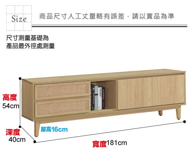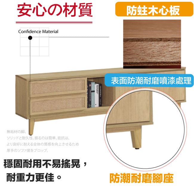 材質 | ◆產品名稱:【綠家居】神奈川編織紋6尺二門二抽電視櫃/視聽櫃 尺寸:(寬)181x(深)41(高)54/公分 ◆材質: 材質:防蛀木心板+防潮耐磨腳座+五金滑軌結構+藤質編織網格+防夾手緩衝門片五金 噴漆:防潮耐磨噴漆處理