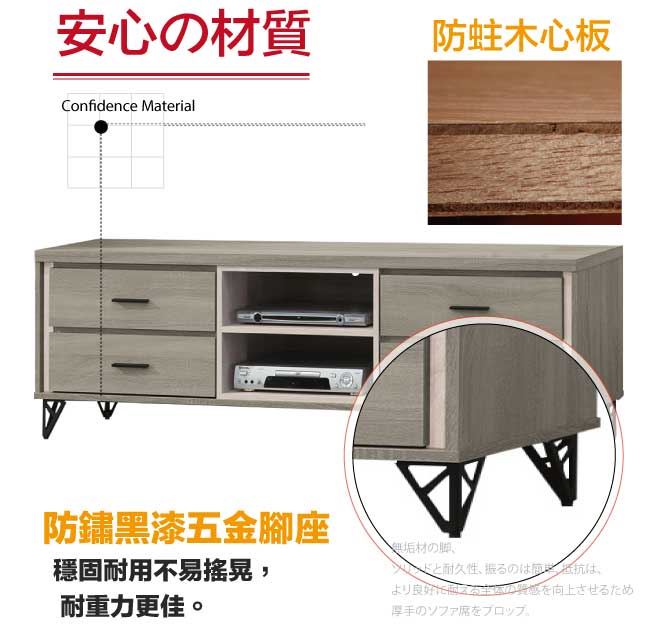 材質 | ◆產品名稱:【綠家居】史莉6尺四抽電視櫃/視聽櫃 尺寸:(寬)180x(深)40(高)57公分 ◆材質: 材質:防蛀木心板+防鏽黑漆五金腳座+五金滑軌結構 噴漆:防潮耐磨噴漆處理