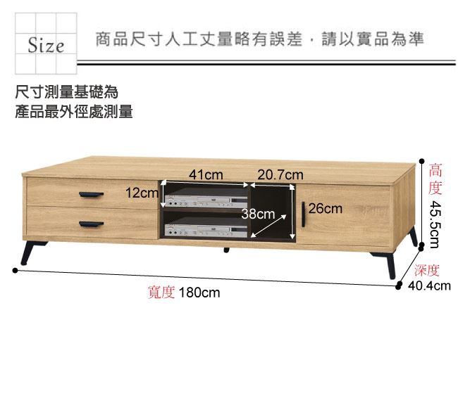 材質 | ◆產品名稱:【綠家居】羅依6尺單門二抽電視櫃/視聽櫃(二色可選) 尺寸:(寬)180x(深)40.4(高)45.5公分 ◆材質: 材質:防蛀木心板+防鏽黑漆五金腳座+五金滑軌結構 噴漆:防潮耐磨噴漆處理