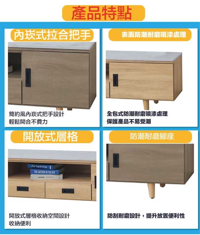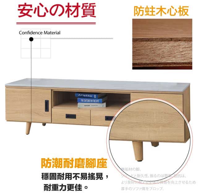 商 品 介 紹 | 【綠家居】羅平6尺二門二抽電視櫃/視聽櫃(二色可選) 二色可選+現代簡約風格+安心材質製造,整體採用防蛀木心板+防潮耐磨腳座+五金滑軌結構+6mm仿雲紋石面木質面板等安心材質製造,產品外層採用防潮耐磨噴漆處理搭配採用開門櫃+二抽屜+開放式收納等收納空間設計,全由專人配送到家,專業安心服務,替你省下更多時間! 【商品特色】 二色可選+現代簡約風格+安心材質製造,使用放心+搭配居家更便利 採用防蛀木心板+防潮耐磨腳座+五金滑軌結構+6mm仿雲紋石面木質面板等安心材質製造 產品外層採用防潮耐磨噴漆處理 搭配採用開門櫃+二抽屜+開放式收納等收納空間設計 此商品不需要DIY組立,此商品為組立後之成品 品質保證、專業設計、貼心服務 全由專人配送到家,專業安心服務,替您省下更多時間