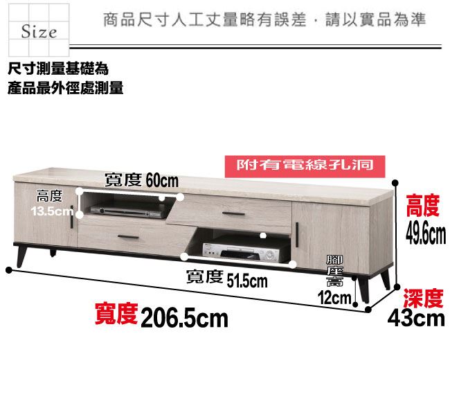 材質 | ◆產品名稱:【綠家居】蒙派安6.9尺二門二抽電視櫃 尺寸:(寬)206.5x(深)43(高)49.6/公分 ◆材質: 材質:防蛀木心板+防鏽烤漆五金腳座+五金滑軌結構+防夾手緩衝門片五金+仿雲紋石紋路木質桌面板(MDF纖維板材質) 噴漆:防潮耐磨噴漆處理