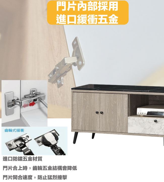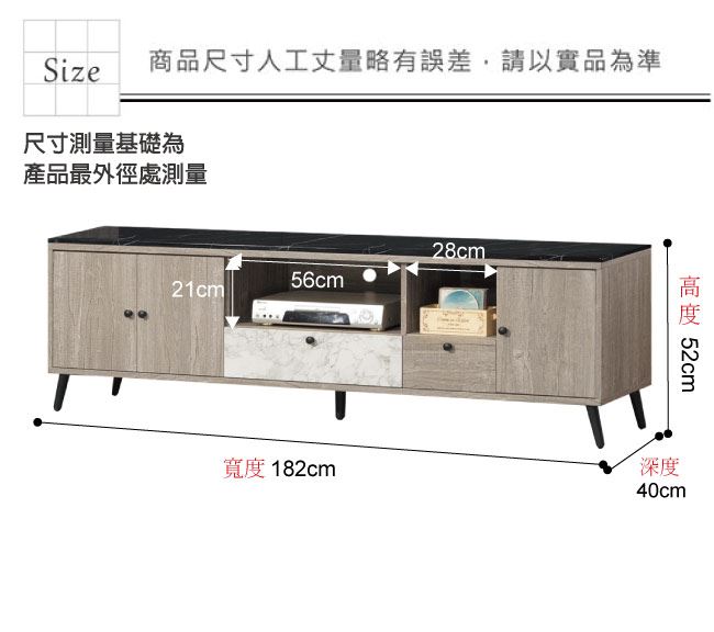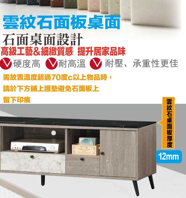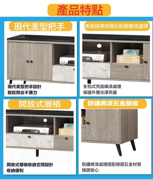 材質 | ◆產品名稱:【綠家居】鋼克6.1尺雲紋石面電視櫃/視聽櫃 尺寸:(寬)182x(深)40(高)52公分 ◆材質: 材質:防蛀木心板+防鏽黑漆五金腳座+五金滑軌結構+12mm雲紋石面桌面板+防夾手緩衝門片五金 噴漆:防潮耐磨噴漆處理
