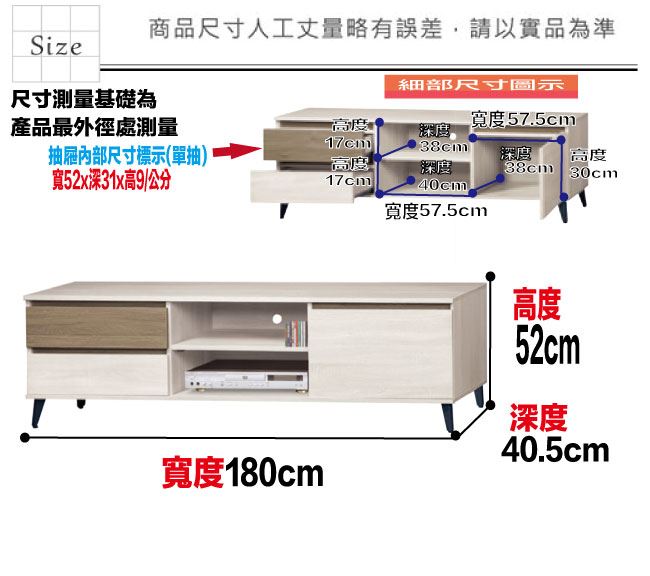 材質 | ◆產品名稱:【綠家居】麥里雙色6尺單門二抽電視櫃 尺寸:(寬)180x(深)40.5(高)52/公分 ◆材質: 材質:防蛀木心板+防鏽黑漆五金腳座+五金滑軌結構+防夾手緩衝門片五金 噴漆:防潮耐磨噴漆處理 |