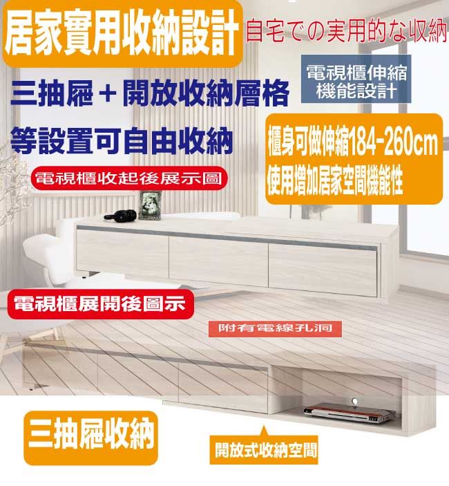 商 品 介 紹 | 【綠家居】安迪爾6.1尺伸縮機能三抽電視櫃 木紋雙色系+現代簡約風格+安心材質製造,整體採用防蛀木心板+防潮耐磨腳座+五金滑軌結構等安心材質製造,產品外層採用防潮耐磨噴漆處理搭配採用三抽屜+內&外開放層格等收納空間設計,全由專人配送到家,專業安心服務,替你省下更多時間! 【商品特色】 木紋雙色系+現代簡約風格+安心材質製造,使用放心+搭配居家更便利 電視櫃櫃身可調整184-260cm伸縮使用,增加居家收納擺設便利性 採用防蛀木心板+防潮耐磨腳座+五金滑軌結構等安心材質製造 產品外層採用防潮耐磨噴漆處理 搭配採用三抽屜+內&外開放層格等收納空間設計 此商品不需要DIY組立,此商品為組立後之成品 品質保證、專業設計、貼心服務 全由專人配送到家,專業安心服務,替您省下更多時間