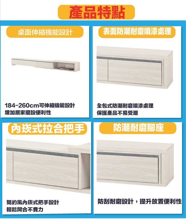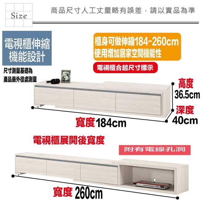 材質 | ◆產品名稱:【綠家居】安迪爾6.1尺伸縮機能三抽電視櫃 尺寸:(寬)184-260x(深)40(高)36.5/公分 ◆材質: 材質:防蛀木心板+防潮耐磨腳座+五金滑軌結構 表面防潮耐磨噴漆處理 |