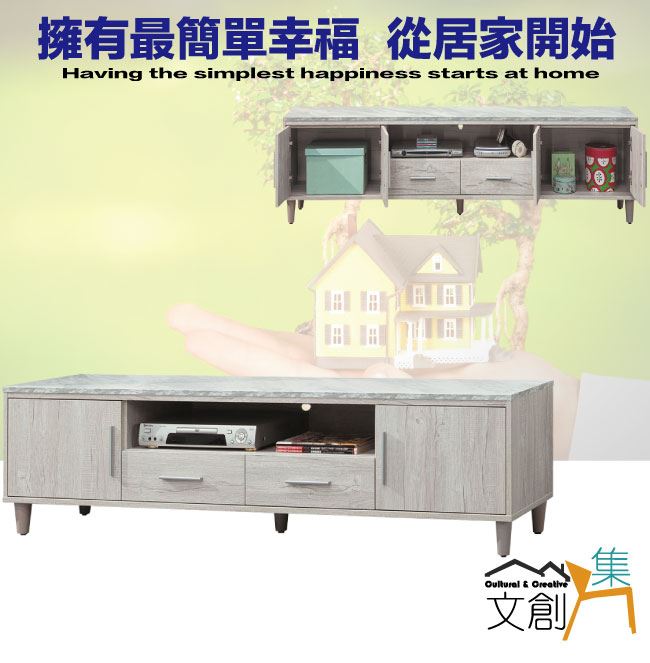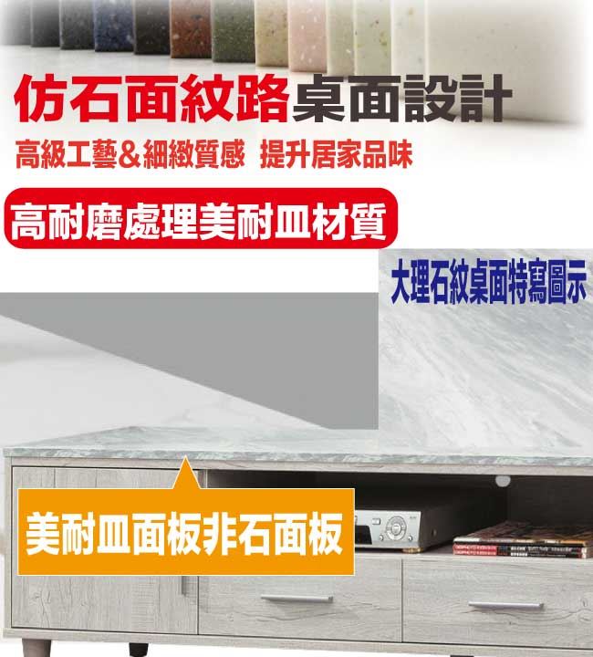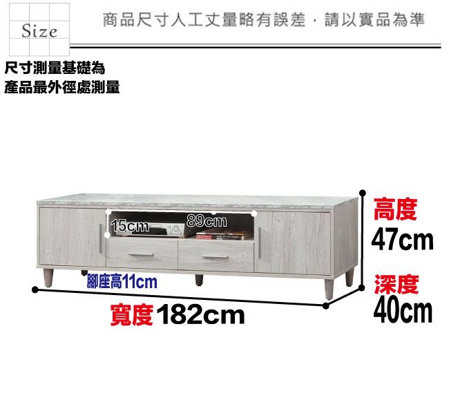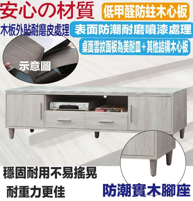 材質 | ◆產品名稱:【綠家居】艾可琳6.1尺二門二抽電視櫃 尺寸:(寬)182x(深)40x(高)47/公分 ◆材質: 材質:防蛀木心板+防潮實木腳座+五金滑軌結構+防夾手緩衝門片五金+仿大理石紋耐磨美耐皿桌面板 表面防潮耐磨噴漆處理 |