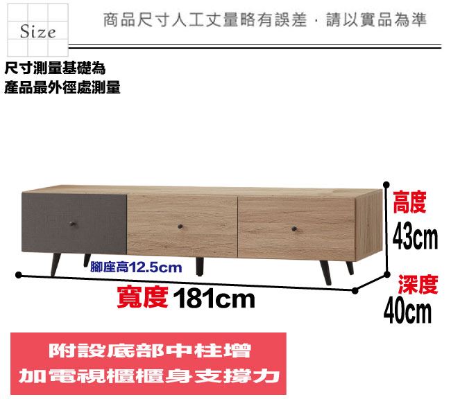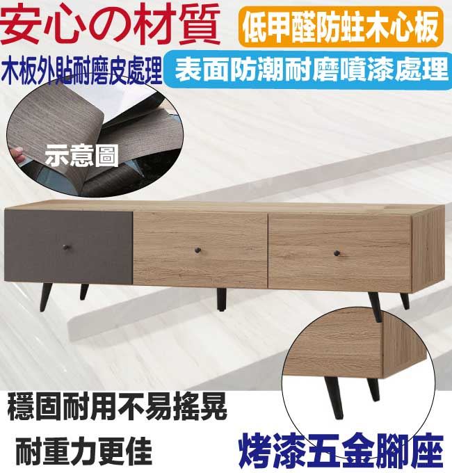材質 | ◆產品名稱:【綠家居】畢曼特雙色6尺三抽電視櫃 尺寸:(寬)181x(深)40x(高)43/公分 ◆材質: 材質:防蛀木心板+烤漆金屬腳座+五金滑軌結構 表面防潮耐磨噴漆處理 |