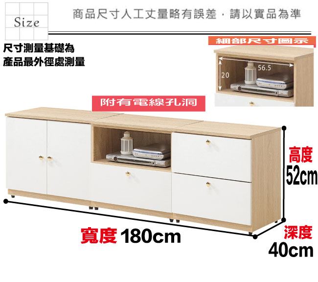 材質 | ◆產品名稱:【綠家居】杜賓利6尺二門三抽電視櫃組合(電視櫃可自行排列收納組合) 尺寸:(寬)180x(深)40(高)52/公分 ◆材質: 材質:防蛀木心板+正面白色面板部份採用採用皮革紋路處理採用皮革紋路處理防水耐磨+五金滑軌結構+防潮耐磨腳座+防夾手緩衝門片五金 噴漆:防潮耐磨噴漆處理 |