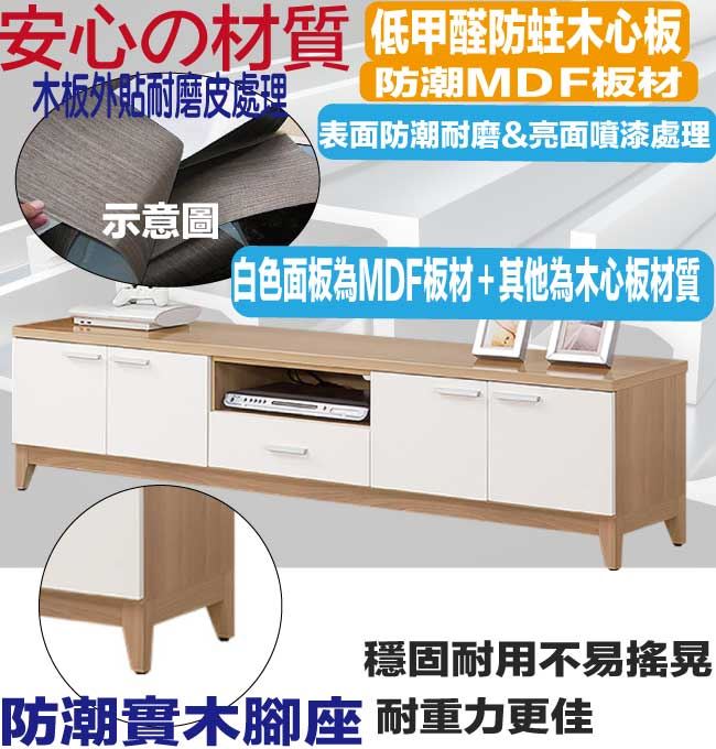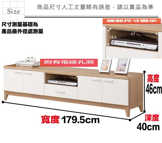 材質 | ◆產品名稱:【綠家居】坦思利雙色6尺四門單抽電視櫃 尺寸:(寬)179.5x(深)40(高)46/公分 ◆材質: 材質:防蛀木心板+防潮MDF板+防潮實木腳座+五金滑軌結構 表面防潮耐磨&亮面噴漆處理 |