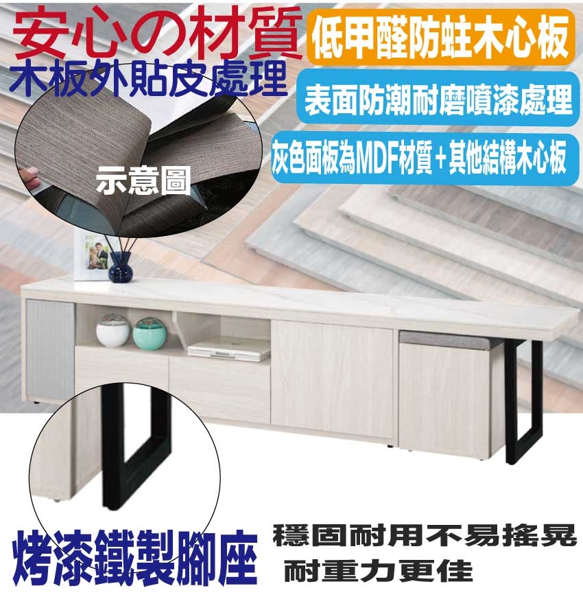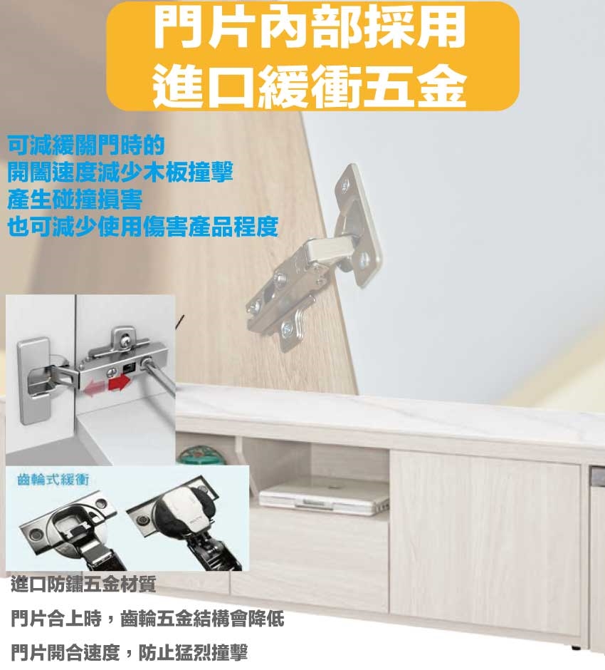 材質:防蛀木心板+防潮MDF板材(灰色耐磨面板)+五金滑軌結構+烤漆金屬腳座+防夾手緩衝門片五金+12mm高硬度岩板桌面板