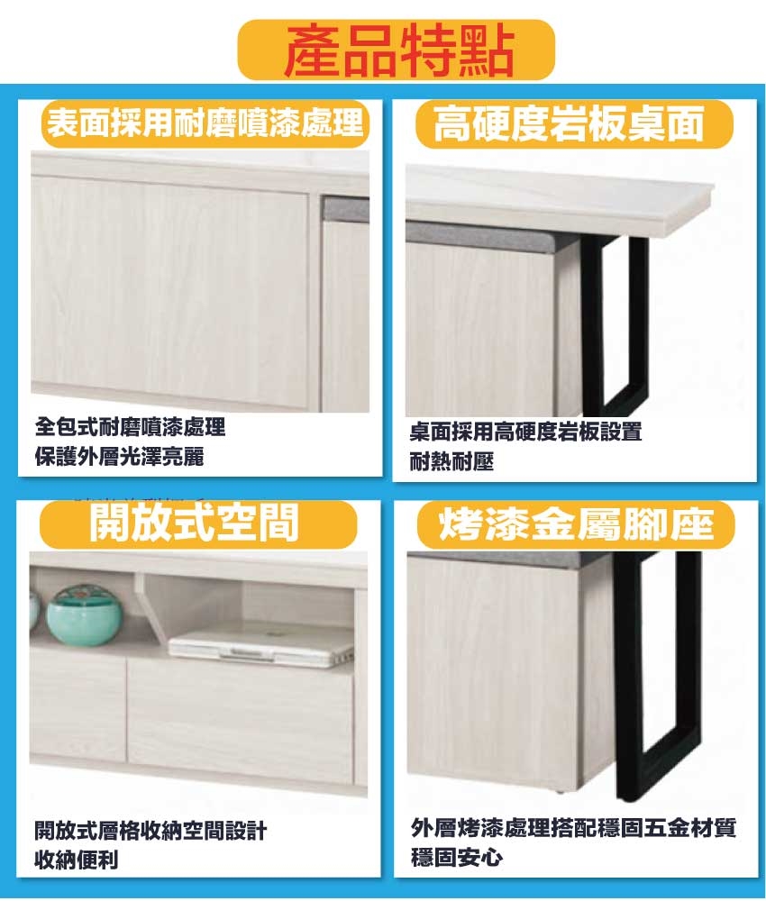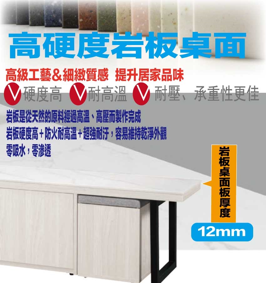 採用防蛀木心板+五金滑軌結構+烤漆金屬腳座+防夾手緩衝門片五金+12mm高硬度岩板桌面板等安心材質製造
