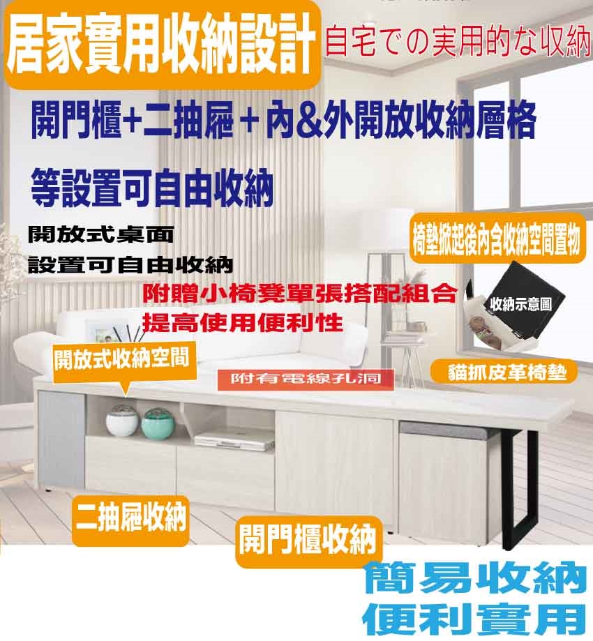 搭配採用開門櫃+二抽屜+內&外開放層格等收納空間設計