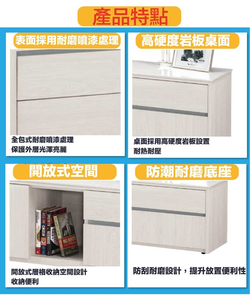 材質:防蛀木心板+防潮耐磨底座+防夾手緩衝門片五金+五金滑軌結構+12mm高硬度岩板桌面板