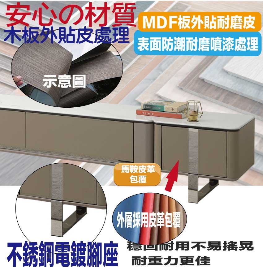 採用防潮MDF板+不鏽鋼電鍍腳座+五金滑軌結構+15mm雲紋石面桌面板+馬鞍皮革包覆等安心材質製造