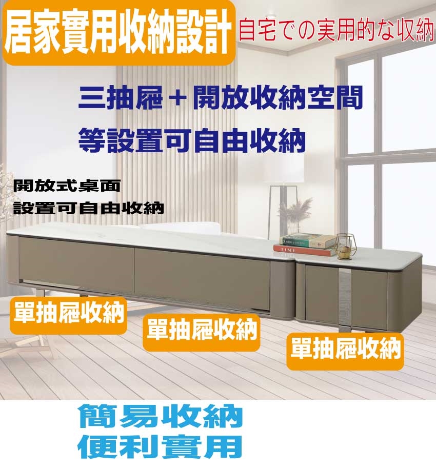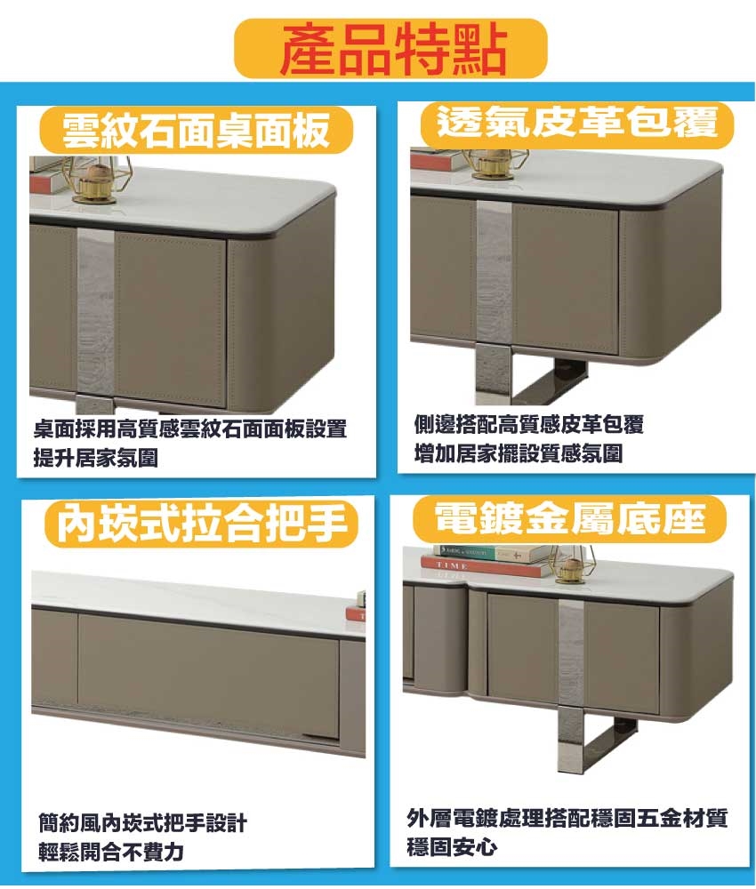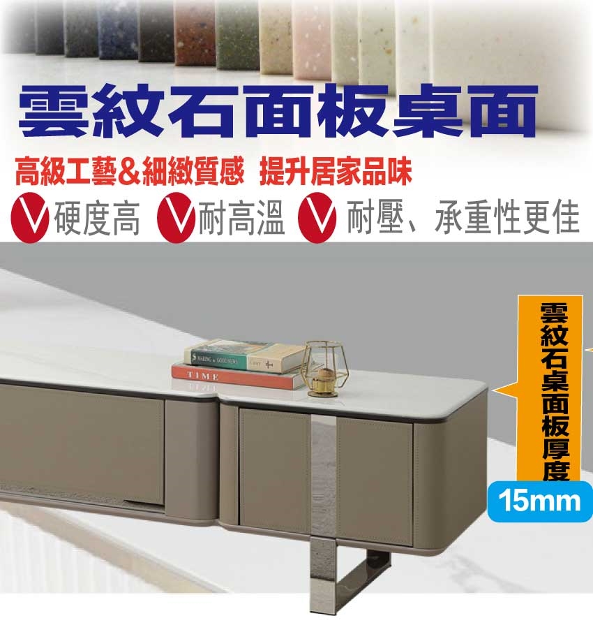 材質:防潮MDF板+不鏽鋼電鍍腳座+五金滑軌結構+15mm雲紋石面桌面板+馬鞍皮革包覆
