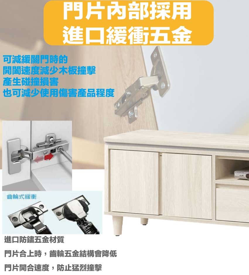 材質:防蛀木心板+防刮實木腳座+五金滑軌結構+防夾手緩衝門片五金